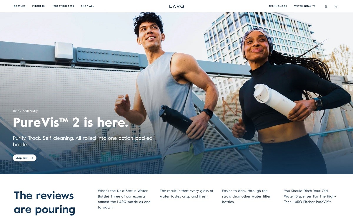 LARQ specializes in innovative hydration solutions, notably their self-cleaning water bottles and advanced filtration systems. Their products utilize UV-C LED technology to purify water and maintain bottle cleanliness, ensuring access to safe drinking water on the go. The website features a clean, user-friendly design with intuitive navigation, high-quality imagery, and detailed product descriptions, providing a seamless shopping experience.