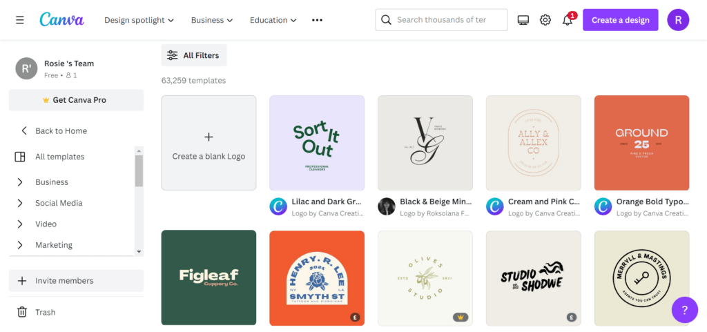 However, unlike Looka, Canva’s logo maker isn’t AI-fuelled. Instead, you can upload images and pick from a library of customizable templates, icons, fonts, etc., to create something unique. In fact, there are a staggering 63,000+ templates explicitly designed for logos, suiting a wide range of industries.