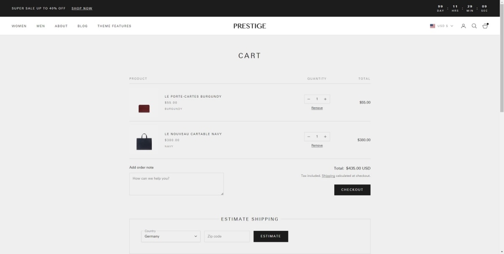 The Prestige Shopify theme is designed for premium, high-end brand appeal, and currently comes with three styles: Coutoure, Vogue and Allure.