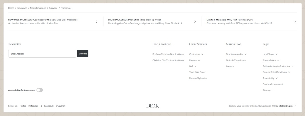 Dior’s website is a luxurious digital flagship that blends editorial storytelling with immersive product discovery across fashion, beauty, and fragrance. The design is elegant and refined, using high-resolution imagery, smooth animations, and intuitive navigation. Products are organized into curated hubs, with features like personalization and behind-the-scenes content enhancing the brand’s couture heritage.