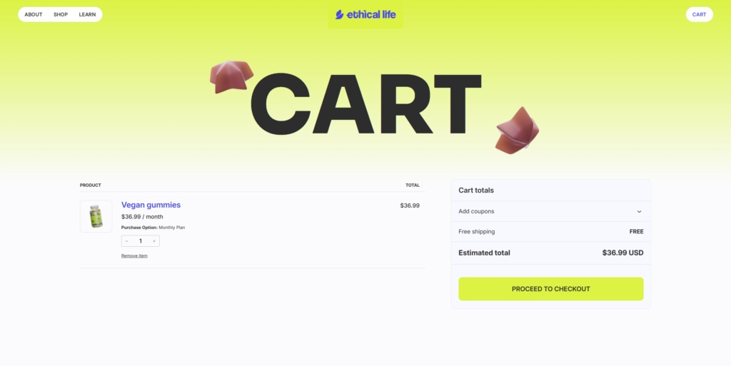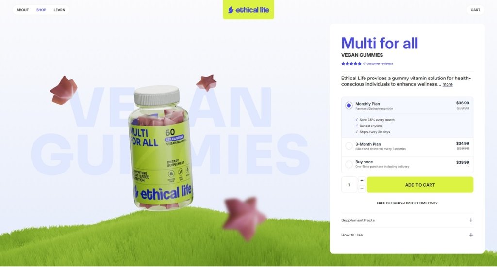 EthicalLife has a clean, minimal design with gentle colours and clear navigation. The site highlights transparency with simple product pages and ethical messaging. Its main product is vegan multivitamin gummies, made with plant-based, non-GMO ingredients. Eco-friendly packaging and flexible subscription options reinforce its mission of wellness with compassion.