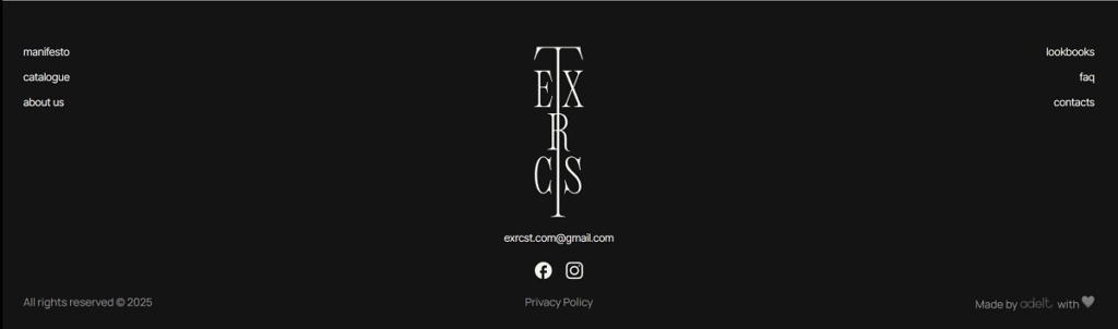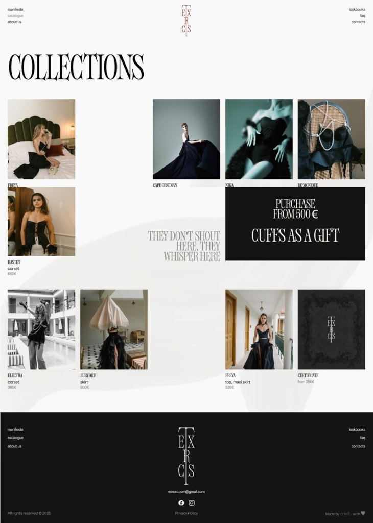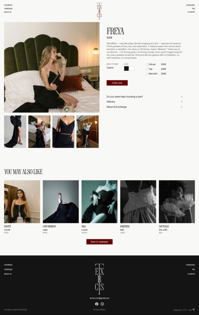 Exrcst’s site is atmospheric and ritualistic — dark-moody visuals, elegant typography, immersive copy that frame the brand as more than clothes. The product offering is luxury, made-to-measure pieces: corsets, skirts, dresses, belts and tops, often limited drops and with strong sensual / feminine expressive themes. The design invites a private, bespoke experience — every purchase involves a fitting or consultation, giving it a sense of exclusivity and craftsmanship.