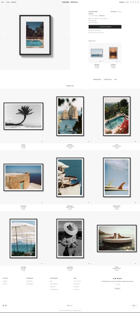 House of Spoils offers a beautifully curated collection of ready-to-hang, framed photography prints from leading global artists, plus select apparel and gift cards. The website features a clean, modular layout with high-resolution visuals, category filters (like themes and artists), and an elegant design recognized for enhancing UX and artistic storytelling. Membership perks, immersive campaign galleries, and editorial touches invite exploration and reinforce the premium, artful experience.